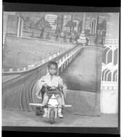 A woman wearing a black and white dress, a necklace, and a black head wrap sitting with a little girl wearing a dress standing by her side, both face-forward in the studio.