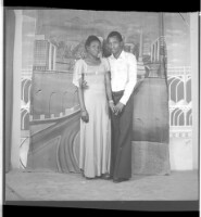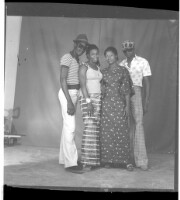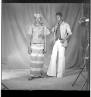 A young girl wearing a camisole, pagne, head wrap, necklace, and earrings standing with a man wearing a black t-shirt, shirt, and white pants, both face-forward in the studio.