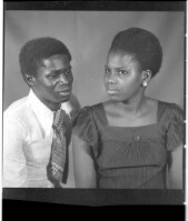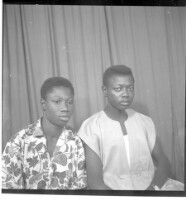 Two young girls standing, the one on the right wearing a black t-shirt, a black pagne, and earrings and the one on the left wearing a black boubou, both face-forward in the studio.