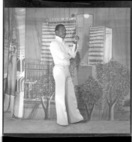 A young girl wearing a white dress and a necklace with her hair styled sitting with a man wearing a grey long-sleeved shirt, both face-forward in the studio.