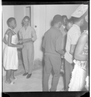 A man wearing a shirt, pants, and glasses standing face-forward next to a girl wearing a dress and necklace standing in profile, both near a crowd of dancers in a room.