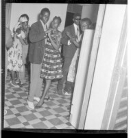A girl wearing a dress, pagne, head wrap, and necklace holding the hand of a man wearing a jacket, tie, and pants, both standing in profile amongst some people in the veranda of a house.