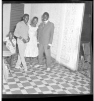 A girl wearing a dress standing face-forward between a man wearing a shirt and pants standing face-forward and another wearing a jacket, pants, and tie standing in profile, a little boy next to them in a room in front of a doorway.