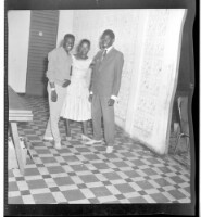 A girl wearing a dress standing face-forward between a man wearing a shirt and pants standing face-forward and another wearing a jacket, pants, and tie standing in profile in a room in front of a doorway.
