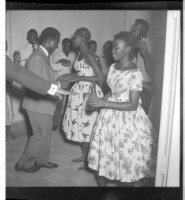 Two girls wearing dresses both sit, one face-forward and the other in profile, next to four men of whom three in suits and ties sit, two face-forward and the other in profile, and the fourth in a jacket and pants stands face-forward, all facing a table fi