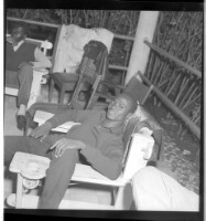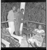 Two girls wearing dresses sitting, one face-forward and the other in profile, in front of a girl wearing a dress between two men wearing shirts and pants, one with a pipe in his mouth, in a veranda in front of some flowers.