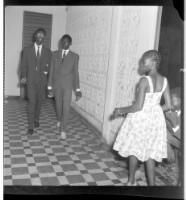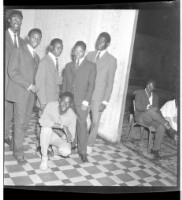A man wearing a shirt and pants sitting face-forward in front of 5 men wearing suits and ties, one in glasses, all standing, two face-forward and three in profile in a room.