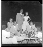 Two men wearing suits and ties sitting in profile next to a girl wearing a dress sitting face-forward, in front of a man wearing a suit and tie next to a girl wearing a dress, both standing face-forward. All face a table filled with bottles and plates of