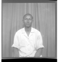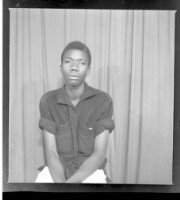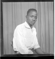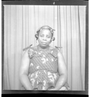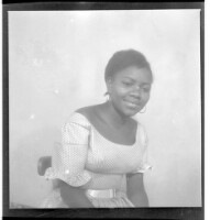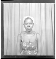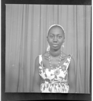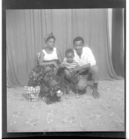 A man wearing a shirt and pants crouching face-forward and holding a child next to a woman wearing a dress, head wrap, and necklace with a bag by her side in the studio.