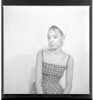 A girl wearing a dress sitting in profile in front of two men wearing shirts and pants both leaning over, one face-forward and the other in profile in the studio.