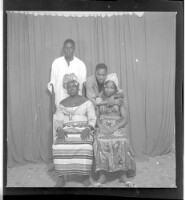 167. EAP449/2/25/167 Reference (shelfmark): EAP449/2/25/167 Title: Two women wearing dresses and head wraps sitting face-forward in front of two men, one wearing a boubou standing face-forward and the other wearing a shirt leaning over face-forward in the studio. Collection Area: Endangered Archives Programme Languages: Not applicable Date Range: 2nd half od the 20th century Extent: 1 TIFF image