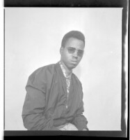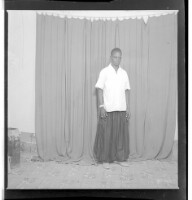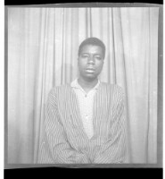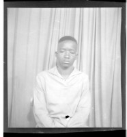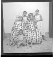 Two women wearing dresses, head wraps, and necklaces, each holding a child on their laps, sitting face-forward in front of two boys wearing shirts, one in glasses standing in profile and the other standing face-forward in the studio.