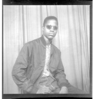 A man wearing a shirt and pants sitting in profile next to a girl wearing a dress, head wrap, and necklace sitting face-forward in front of a man wearing a shirt and pants standing face-forward in the studio.