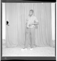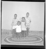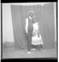 A man wearing a shirt, vest, tie, pants, and hat standing face-forward next to a girl wearing a dress, head wrap, and necklace standing in profile in the studio.