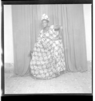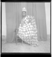 208. EAP449/2/25/208 Reference (shelfmark): EAP449/2/25/208 Title: A woman wearing a dress, head wrap, and necklace standing in profile posing with her foot on a chair in the studio. Collection Area: Endangered Archives Programme Languages: Not applicable Date Range: 2nd half od the 20th century Extent: 1 TIFF image