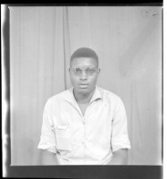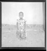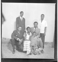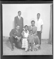 A little boy wearing a suit and tie standing face-forward in front of a woman in a skirt, pagne, head wrap, and necklace sitting in profile between two men wearing suits and ties both sitting, one face-forward and the other in profile, all in front of two