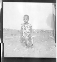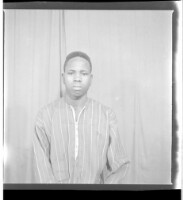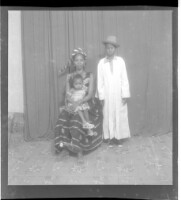 A boy wearing a boubou and hat standing face-forward next to a woman wearing a dress and head wrap sitting face-forward holding a baby in her lap in the studio.