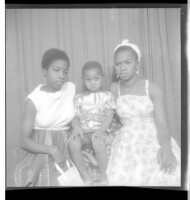 278. EAP449/2/25/278 Reference (shelfmark): EAP449/2/25/278 Title: A little boy wearing a shirt sitting face-forward between two women, one wearing a dress, head wrap, and necklace and the other wearing a dress and skirt, both sitting in profile in the studio. Collection Area: Endangered Archives Programme Languages: Not applicable Date Range: 2nd half od the 20th century Extent: 1 TIFF image