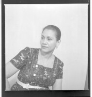 285. EAP449/2/25/285 Reference (shelfmark): EAP449/2/25/285 Title: A woman wearing a dress, head wrap, and necklace standing in profile in the studio. Collection Area: Endangered Archives Programme Languages: Not applicable Date Range: 2nd half od the 20th century Extent: 1 TIFF image