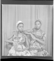 345. EAP449/2/25/345 Reference (shelfmark): EAP449/2/25/345 Title: A girl wearing a dress and head wrap sitting in profile in front of another wearing a dress bending over in profile in the studio. Collection Area: Endangered Archives Programme Languages: Not applicable Date Range: 2nd half od the 20th century Extent: 1 TIFF image