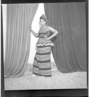 341. EAP449/2/25/341 Reference (shelfmark): EAP449/2/25/341 Title: A woman wearing a dress, pagne, head wrap, and necklace standing in profile in the studio. Collection Area: Endangered Archives Programme Languages: Not applicable Date Range: 2nd half od the 20th century Extent: 1 TIFF image