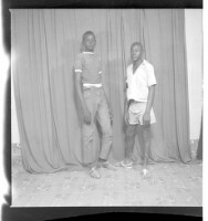 356. EAP449/2/25/356 Reference (shelfmark): EAP449/2/25/356 Title: Two boys, one wearing a t-shirt and pants standing face-forward and the other in shorts and a shirt standing in profile in the studio. Collection Area: Endangered Archives Programme Languages: Not applicable Date Range: 2nd half od the 20th century Extent: 1 TIFF image