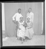 387. EAP449/2/25/387 Reference (shelfmark): EAP449/2/25/387 Title: Two girls wearing dresses, head wraps, and necklaces, both sitting face-forward in front of two men wearing shirts and glasses both standing, one face-forward and the other in profile in the studio. Collection Area: Endangered Archives Programme Languages: Not applicable Date Range: 2nd half od the 20th century Extent: 1 TIFF image