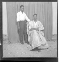 389. EAP449/2/25/389 Reference (shelfmark): EAP449/2/25/389 Title: A man wearing a shirt and pants standing in profile next to a man wearing a boubou sitting face-forward in the studio. Collection Area: Endangered Archives Programme Languages: Not applicable Date Range: 2nd half od the 20th century Extent: 1 TIFF image