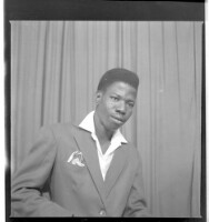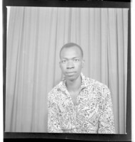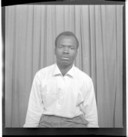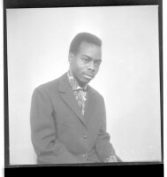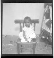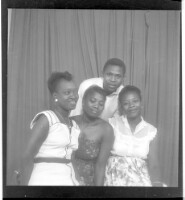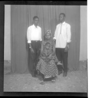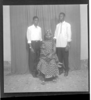 A woman wearing a dress and head wrap sitting face-forward holding a baby in her lap in front of two men wearing shirts and pants both standing in profile in the studio.
