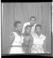 Three girls wearing dresses and necklaces all sitting, one face-forward and two in profile, in front of a man wearing a shirt bending over face-forward in the studio.