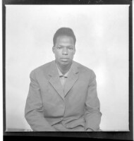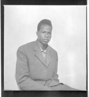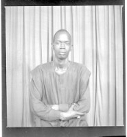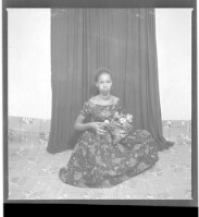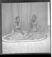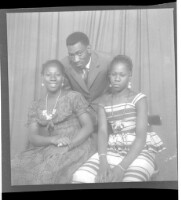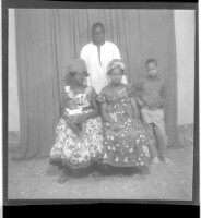Two women wearing dresses, head wraps, and necklaces, one holding a child on her lap, both sitting, one face-forward and one in profile; by their sides a boy standing face-forward all in front of a man wearing a boubou standing face-forward in the studio.