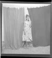 Two girls wearing dresses and necklaces both sitting, one face-forward and the other in profile, both in front of a man wearing a jacket and tie bending over in profile in the studio.