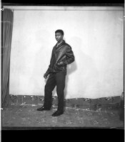 91. EAP449/2/26/91 Reference (shelfmark): EAP449/2/26/91 Title: A young man wearing a black shirt, black pants, and black shoes standing in profile in the studio. Collection Area: Endangered Archives Programme Languages: Not applicable Date Range: 2nd half od the 20th century Extent: 1 TIFF image