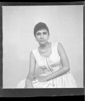 100. EAP449/2/26/100 Reference (shelfmark): EAP449/2/26/100 Title: A young girl wearing a dress, earrings, and a necklace with her hair styled sitting in profile in the studio. Collection Area: Endangered Archives Programme Languages: Not applicable Date Range: 2nd half od the 20th century Extent: 1 TIFF image