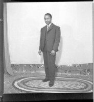 165. EAP449/2/26/165 Reference (shelfmark): EAP449/2/26/165 Title: A man wearing a white shirt, black suit, black pants, and black shoes standing on a mat in profile in the studio. Collection Area: Endangered Archives Programme Languages: Not applicable Date Range: 2nd half od the 20th century Extent: 1 TIFF image