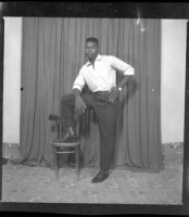 168. EAP449/2/26/168 Reference (shelfmark): EAP449/2/26/168 Title: A man wearing a white long-sleeved shirt, a watch, black pants, and black shoes standing face-forward with his foot on the chair in the studio. Collection Area: Endangered Archives Programme Languages: Not applicable Date Range: 2nd half od the 20th century Extent: 1 TIFF image