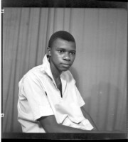 189. EAP449/2/26/189 Reference (shelfmark): EAP449/2/26/189 Title: Sakaly sitting wearing a grey short sleeved shirt and shorts, arms and legs crossed and smiling in profile in the studio. Collection Area: Endangered Archives Programme Languages: Not applicable Date Range: 2nd half od the 20th century Extent: 1 TIFF image