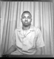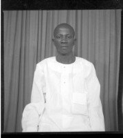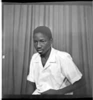 A young girl standing on a mat and wearing a black and white dress, a watch, and earrings with her hair styled, standing in profile with her left hand on her hip in the studio.