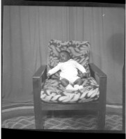 A woman wearing a white dress with her hair styled, smiling and standing with a little boy wearing a shirt, both face-forward with two empty chairs in the studio.