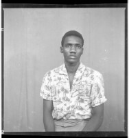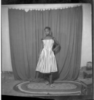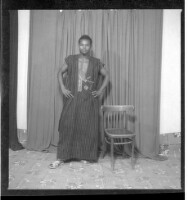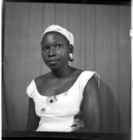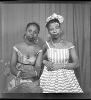 Two women sitting face-forward, the one on the right wearing a camisole, pagne, a watch, a bracelet, a ring, earrings, and a head wrap with her arms crossed and the other wearing a blue and white dress, a head wrap, earrings, a necklace, and a watch with