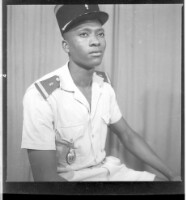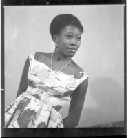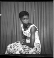 A young girl wearing a camisole, black pagne, a black head wrap, a necklace, a watch, and earrings with her hair styled sitting in profile with her arms and legs crossed in the studio.