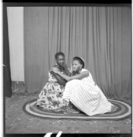 Two young girls crouching in profile on their knees, the one on the right wearing a black and white dress and earrings with her hair styled and the one on the left wearing a white dress, a hat, and her hands on her face, holding each other in the studio.
