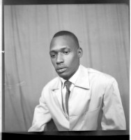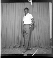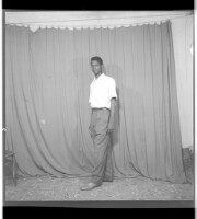 A young man wearing a white short-sleeved shirt, black pants, brown shoes, and a watch standing face-forward with his hand in his pocket in the studio.