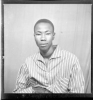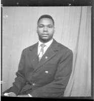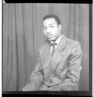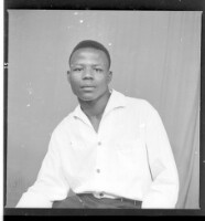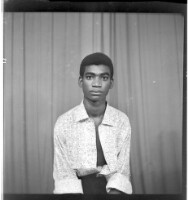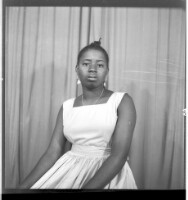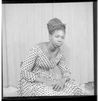 A woman wearing a black dress, a white head wrap, earrings, a necklace, and a ring with her hair styled sitting face-forward with her arms crossed in the studio.