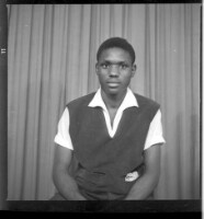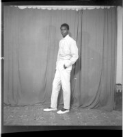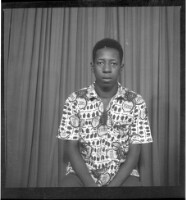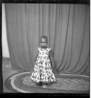 A young girl wearing a white dress, a black and white pagne, earrings, and a head wrap standing on a mat with a man wearing a white shirt, black suit, white pants, and black shoes, both face-forward in the studio.
