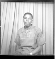 A woman wearing a black dress, a white head wrap, earrings, a ring, and a necklace with her hair styled sitting face-forward with her arms crossed in the studio.