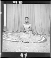 34. EAP449/2/26/34 Reference (shelfmark): EAP449/2/26/34 Title: Full shot of a woman sitting on a rug wearing a dress, arms crossed in the studio. Collection Area: Endangered Archives Programme Languages: Not applicable Date Range: 2nd half od the 20th century Extent: 1 TIFF image