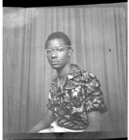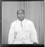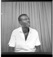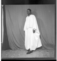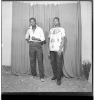 Two young men standing face-forward, the one on the right wearing a white long-sleeved shirt and the one on the left wearing a t-shirt with a parachute drawing, black pants, and a watch, and the one on the left wearing a cosmopolitan ""Deux Poches"" (""Two