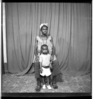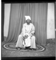 432. EAP449/2/26/432 Reference (shelfmark): EAP449/2/26/432 Title: A woman wearing a camisole, pagne, head wrap, earrings, a watch, and a necklace sitting face-forward with a little boy wearing a t-shirt and shorts standing in the studio. Collection Area: Endangered Archives Programme Languages: Not applicable Date Range: 2nd half od the 20th century Extent: 1 TIFF image