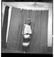 436. EAP449/2/26/436 Reference (shelfmark): EAP449/2/26/436 Title: A woman wearing a camisole, pagne, head wrap, earrings, and a watch standing in profile in the studio. Collection Area: Endangered Archives Programme Languages: Not applicable Date Range: 2nd half od the 20th century Extent: 1 TIFF image